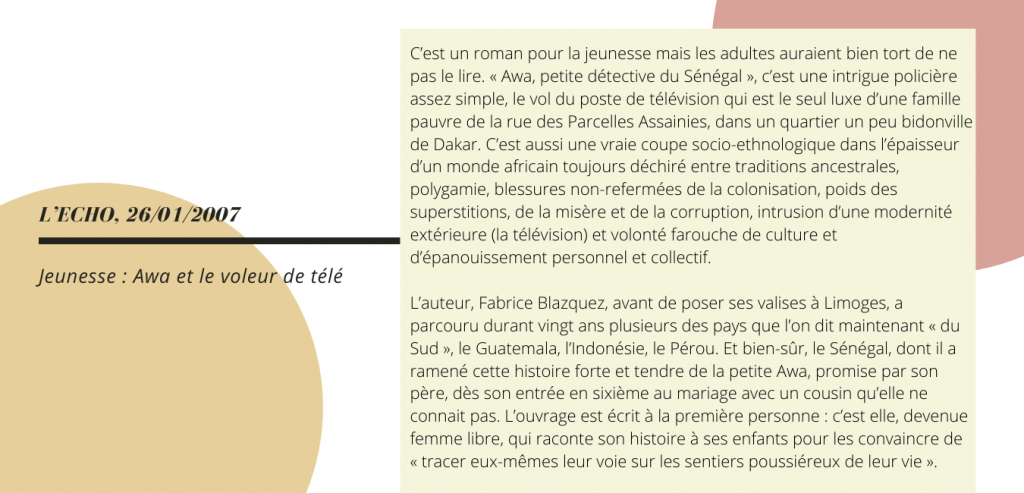 À Dakar, Awa, petite détective du Sénégal, enquête sur le vol du poste de télévision qui est le seul luxe de sa famille. Entre intrigue policière, critique sociale et portrait d’une fillette déterminée, le roman dessine une ville prise entre traditions ancestrales, modernité et injustices.